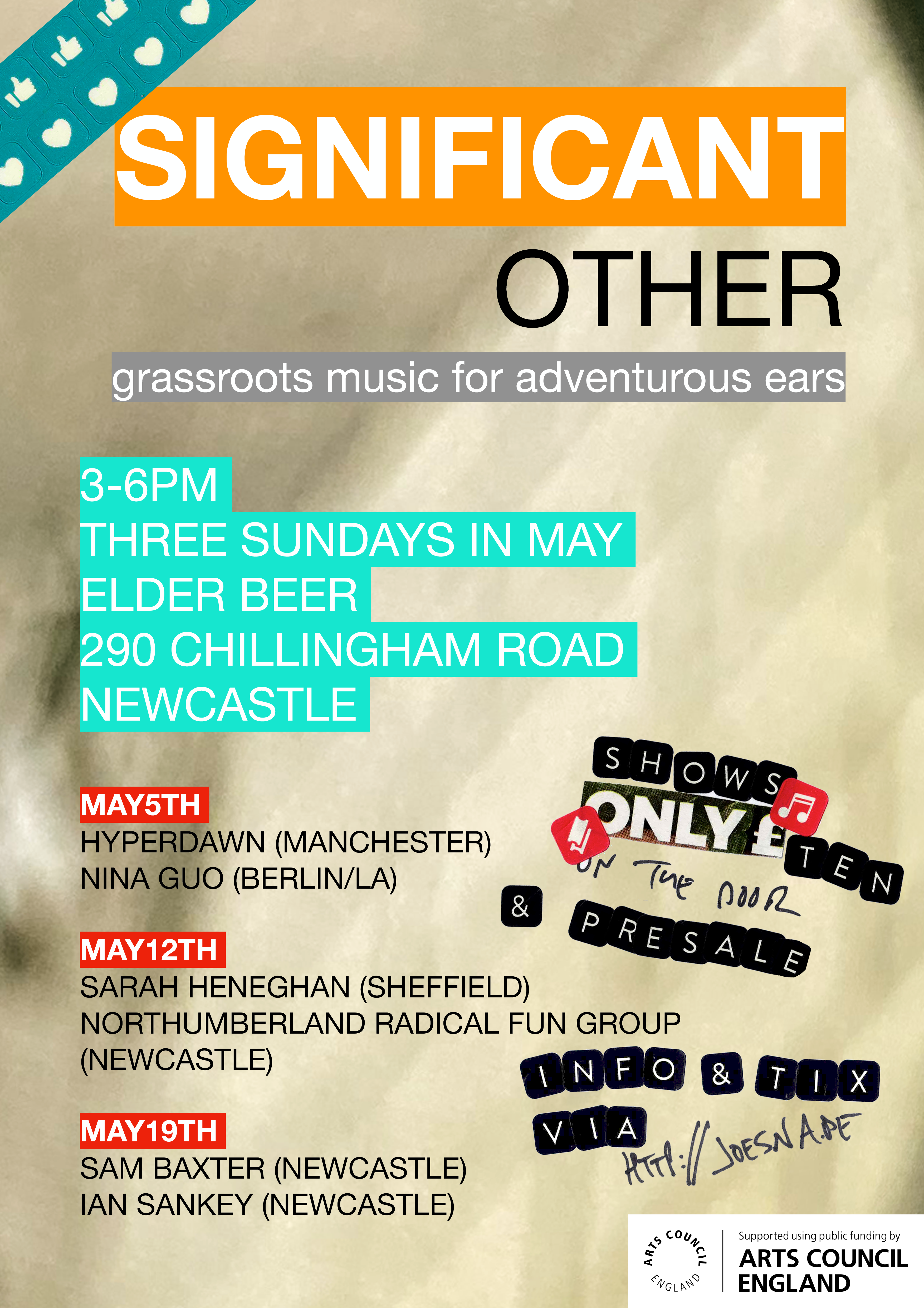 The three shows will take place in Elder Beer Café’s back yard from 3pm to 6pm in Heaton, Newcastle. This small but adequate page will soon have a link to tickets for the events, and after the festival will function as an archive page for what, with a bit of luck, will become a yearly fixture. Thanks so far to Ed Sharp, to the folks at Hand Of, and to all the artists who have taken the punt of playing at the first ever edition. Below there’s info about the three dates in May; if you’re in Newcastle, come down! The shows will be small and tightly packed and–I hope and expect–very special afternoons. Come down and be part of the start of something; help shape our Significant Other.